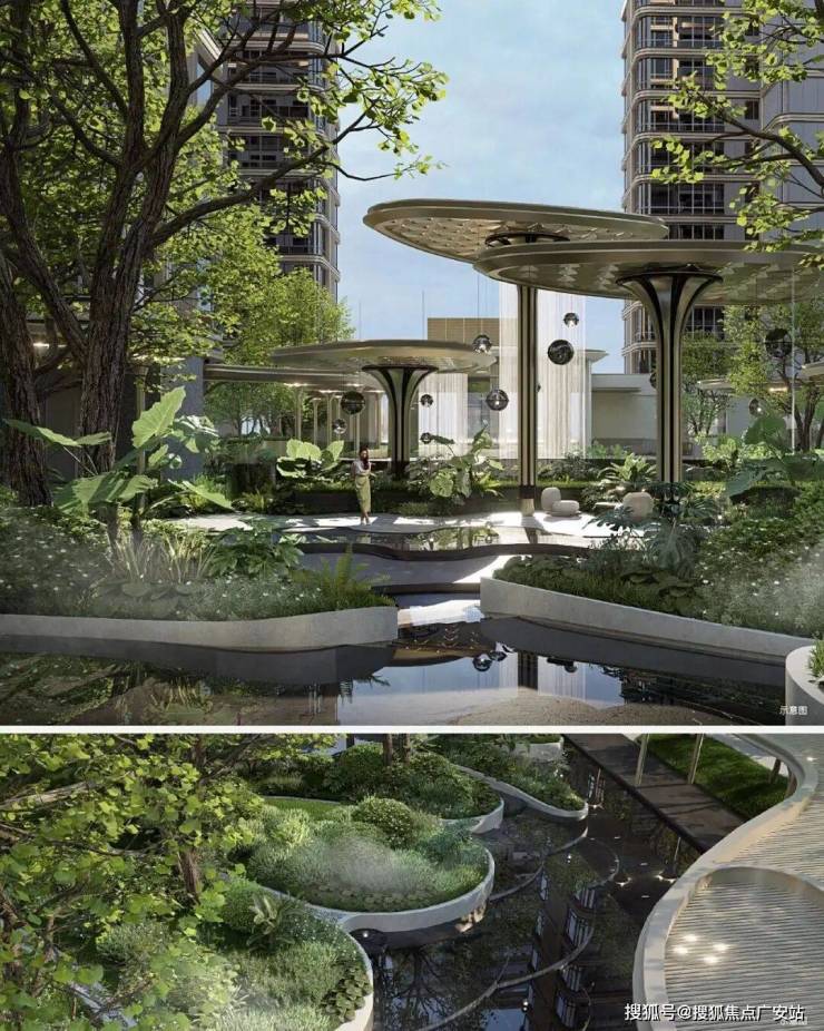 未来社区内整体园林设计仍以“浮岛”概念为核心,通过林岛漫步、循水归岸、闲庭雅致多层次景观布局,四季更迭的花卉搭配香草植物,营造沉浸式森居体验,让视觉与嗅觉共同沉浸于自然诗意。