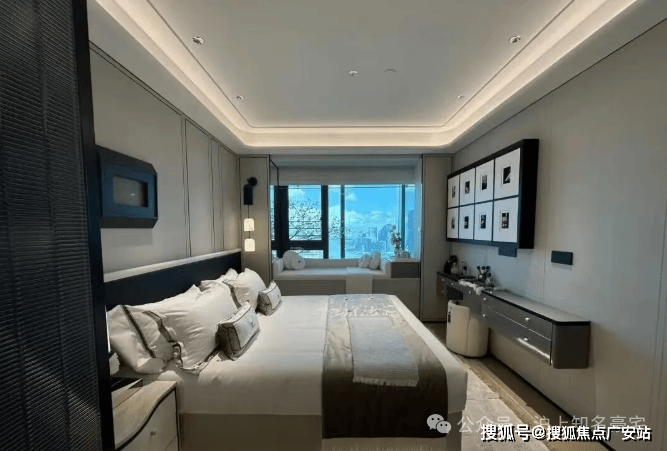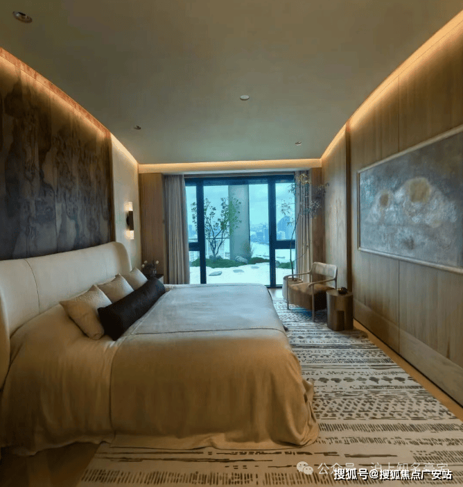 主卧背景墙更以威尼斯安缦酒店同款树瘤木,搭配巴黎宝格丽酒店同源羊皮纸,将全球顶奢酒店的居住质感搬进家中,每一处选材都彰显塔尖人居的高奢基因!
