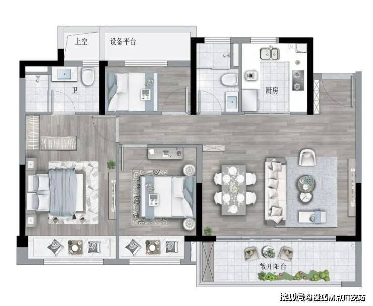 餐客厨一体化设计,让开间足足约4米,外接约1.8米进深、约6.9米宽的超大阳台,整体的通透感、采光度无敌了,完胜周边;