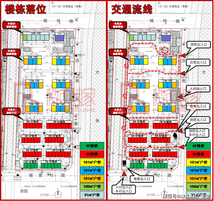 交通流线:小区车行出入口以及人行出入口均位于地块南侧与东侧,机动车进入小区可直接下地库。需要注意的是,小区地面存在停车位(已用红圈标出),如要实现人车分流需通过管理手段。同时,在选房时要注意这些出入口所带来的噪声影响。(本批次楼栋基本不受噪声影响)社区配套:社区配套用房主要集中在地块东北角、东侧人行出入口处以及高层楼栋之间,其中,特别需要注意的不利配套是P站,暗红色块已在图上标出,选房时请注意!