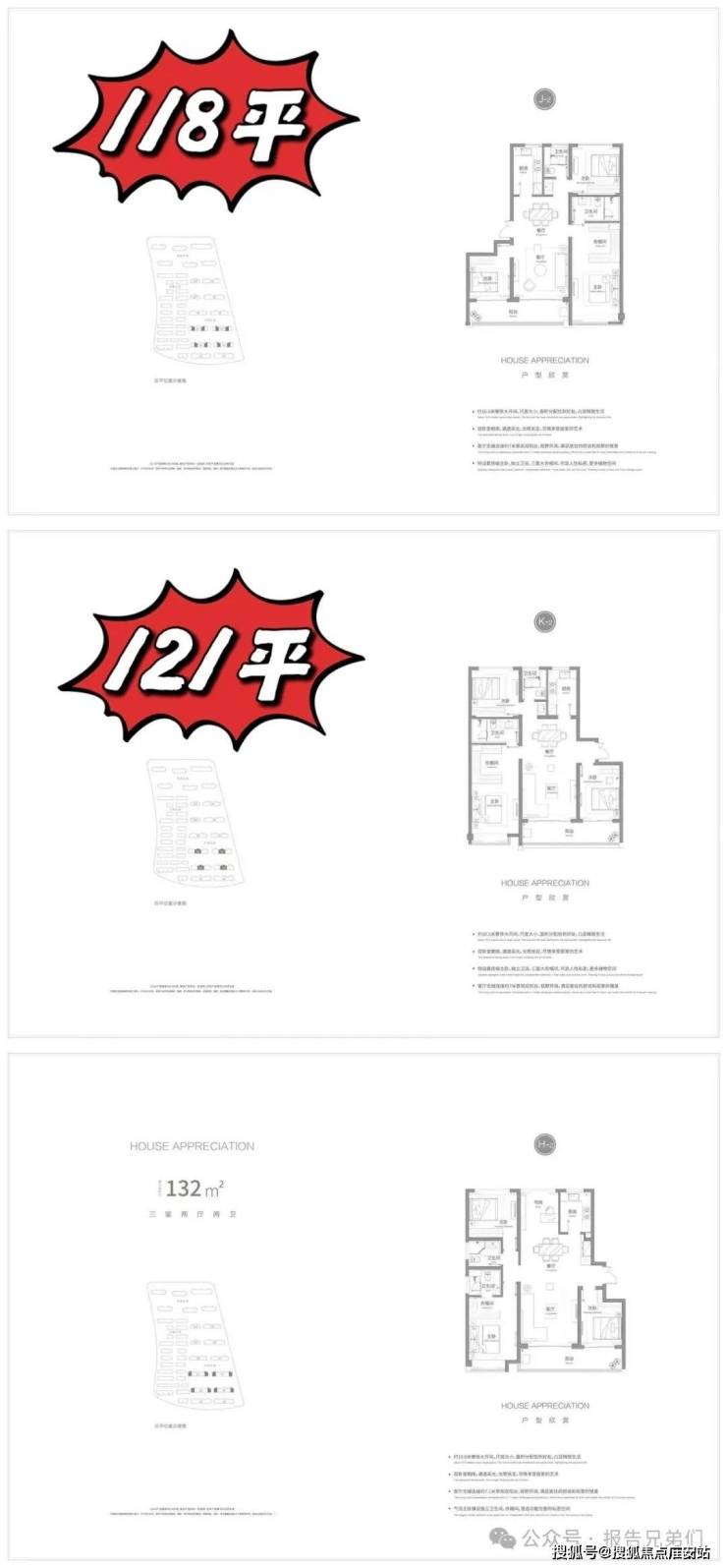 洋房有 118㎡、121㎡、132㎡三种户型,均为两卧朝南,双联阳台竖厅,和当下流行的大面宽、短进深的横厅相比,房屋中间的餐厅采光会受到一定的影响。