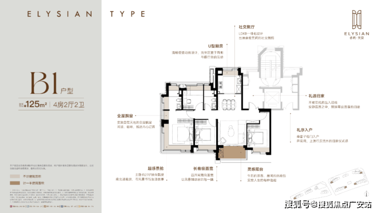 保利天奕设计了两个120㎡左右的户型,分别是建面约125㎡边套户型和建面约118㎡中间套户型。