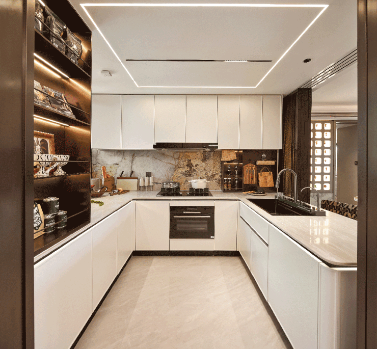 客厅南北通,U型厨房操作台面极致宽敞,而且还利用飘窗提升台面深度,操作更顺手,台面也能放下更多厨具调料。
