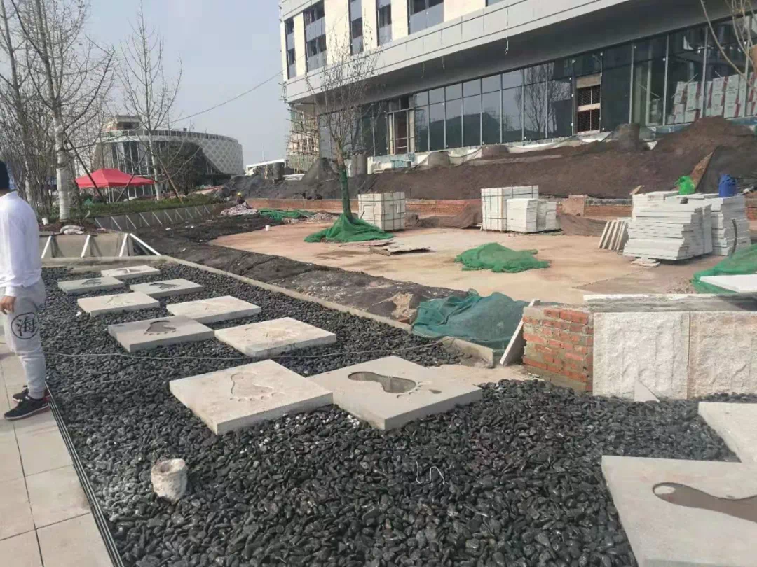 图中心花园设计为“寻梦之圆”,距离“寻梦之圆”不到20米,就是“闯”新之路。这条路大约有20米左右,整条折线式布局,用石板铺成,每个石板上都刻有一个脚印。传达着一步一个脚印、摸着石头过河、脚踏实地的改革精神,也象征着中建钢构不畏艰难、一步一个脚印铸造精品的精神。