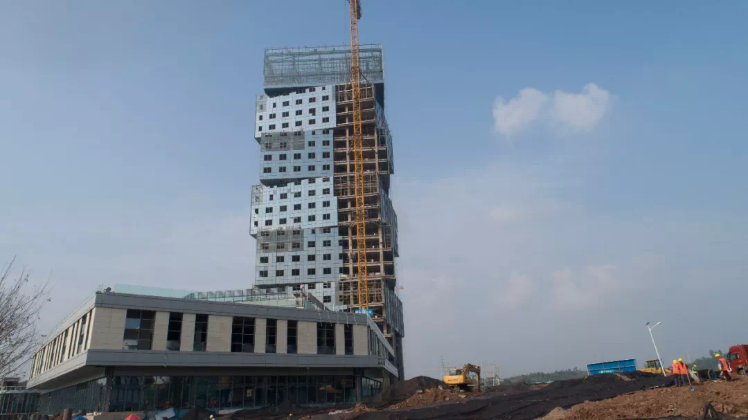 园区还矗立着一座转体式建筑,由5个错位的方体构成,看上去有木有很高端?这就是深广大厦,在建设过程中,中建钢构平均5天修2层,真正在广安实现了深圳速度,未来将作为入驻广深产业园企业的写字楼,它的寓意也很丰富。设计结合了深圳大运会火炬塔和广安白塔元素,象征着深圳和广安两地紧密合作。