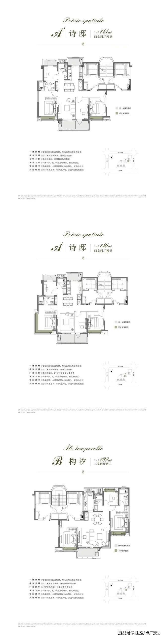 户型:主力116-146㎡3-4房,一梯一户设计,四阳台配置(含270°转角飘窗),部分户型赠送面积较大