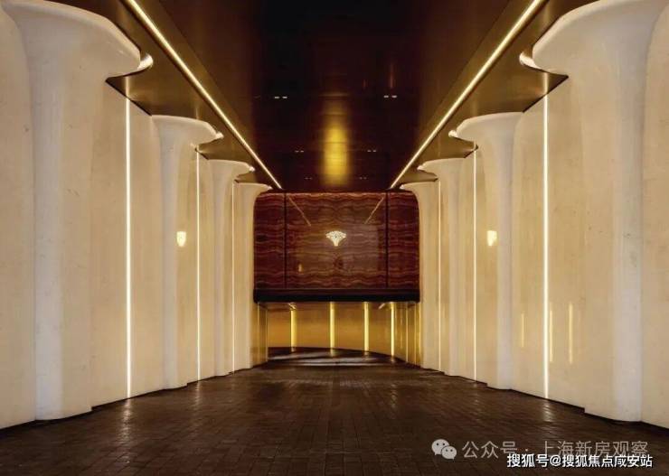 6、社区含“奢材”量很高。门庭延街的外立面,以精工定制弧形米色石材为主调,镶嵌典藏级老虎玉大理石,点缀古铜色现代海派艺术感灯器,整体呈现出百年海派的贵雅气质。