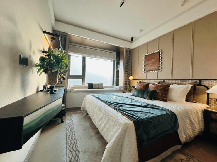 市面上大多百平小三房,都是“伪”三房,实际使用起来空间十分局促。国贸海屿佘山户型设计上是空前绝后:主卧套房+南向双飘窗+北房间也能够作成卧室,整体的得房率做到了78-80%。