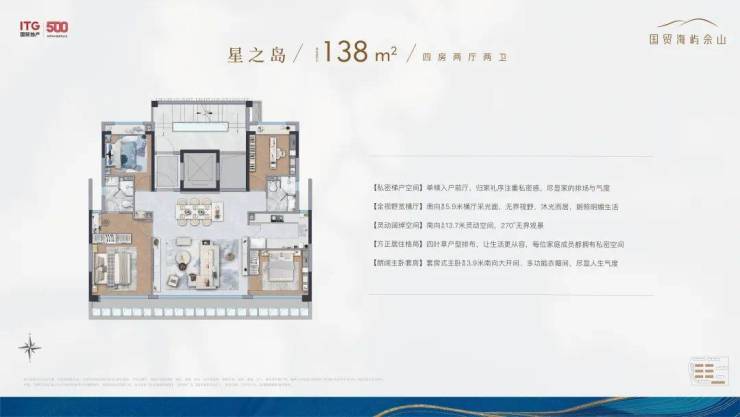 建面约138㎡的4房2厅2卫,全视野宽阔横厅,客餐厅通透放大化空间设计,主卧豪华套房,拥有私人空间。