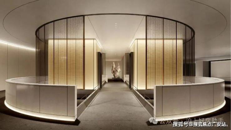 比起中规中矩的直线,弧形施工工艺更复杂、造价更高,却多了几分灵动轻盈!这种弧形的元素不只是在样板间里,在售楼处也能经常看到,比如电梯厅。