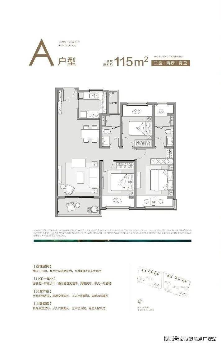 约115㎡户型在105㎡的基础上进行升级,同样南向三开间,LDK一体化客餐厨设计,连接阔绰阳台,采光视野俱佳。
