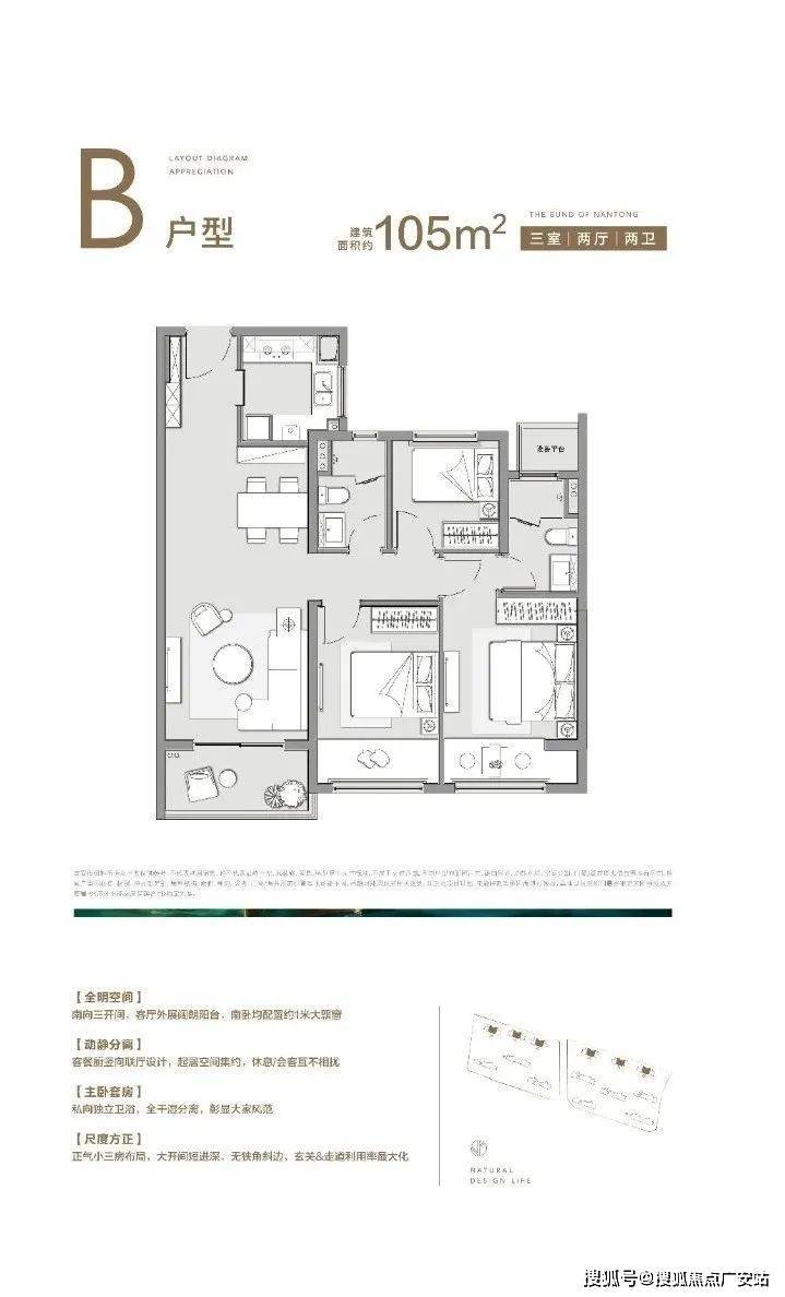 三开间朝南,客厅外展尺度阳台,采光丰富;餐客厅竖向联厅设计,动线空间集约,生活互不干扰。
