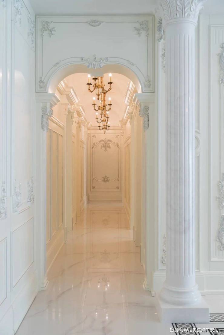 步入玄关,白色调的纯净映入眼帘,地面铺设卡拉拉白大理石瓷砖,以自然纹理呈现空间的柔和通透感。奢石与金属元素相互碰撞出复古情调,简洁的石膏雕花元素将法式独有的浪漫氛围拉满。