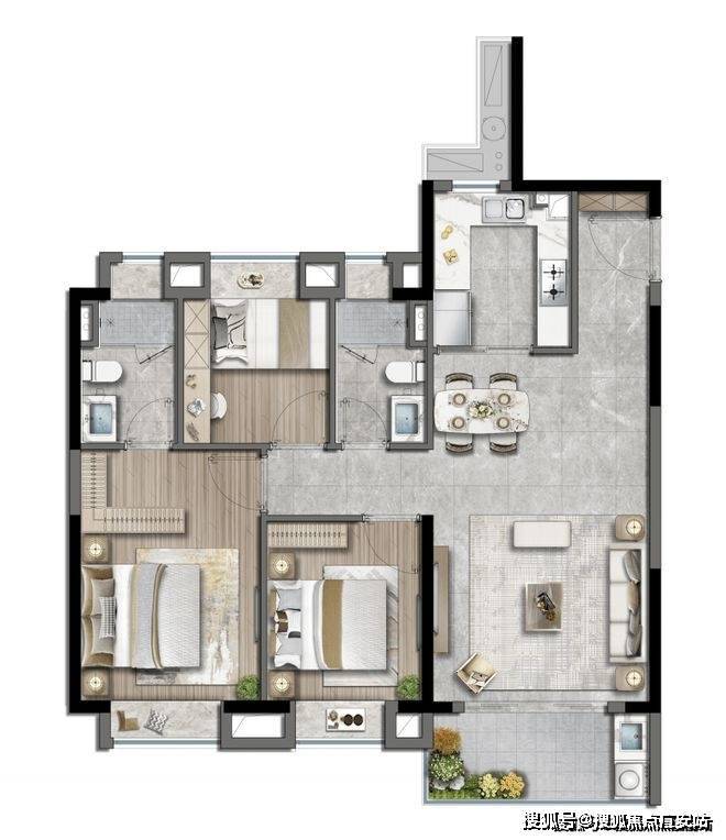 仅仅约129㎡,实现4房功能性,匹配当下越来越多的二胎和三代同堂家庭!