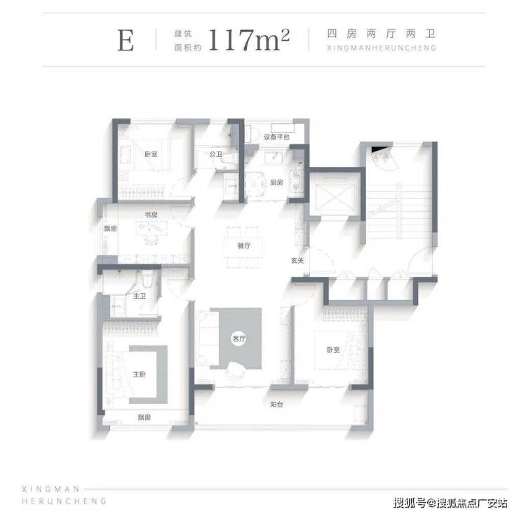 约117㎡户型点评:全明方正通透,提升空间利用率,LDKB一体,营造大尺度餐客双厅,亲朋从容相聚,双开间观景阳台,晾晒之余,亦可成为兴趣天地,四房功能,让家庭成长的理想一步到位