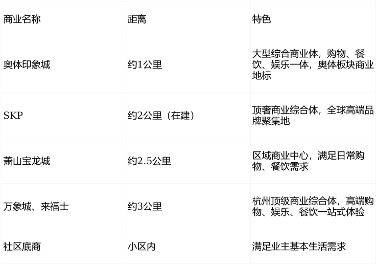 🛍️顶级商业配套环伺:直线距离不足1公里可达奥体印象城,约2公里可达SKP(在建)、萧山宝龙城,3公里范围内覆盖万象城、来福士等顶级商业综合体,满足高端购物需求