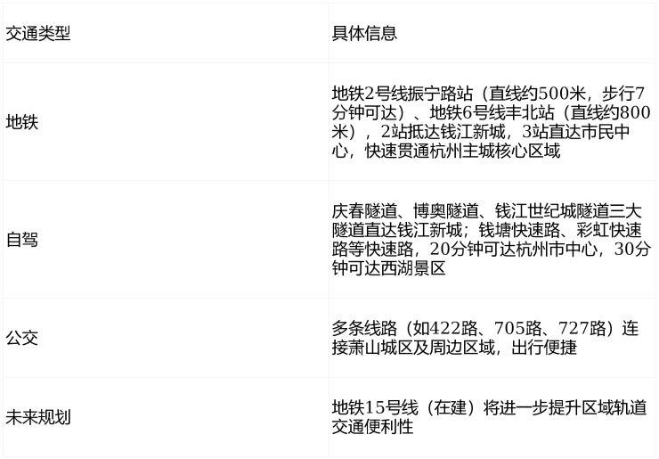 🚇双地铁便捷通勤:直线约500米可达地铁2号线振宁路站,约800米可达地铁6号线丰北站,2站抵达钱江新城,3站直达市民中心,快速贯通杭州主城核心区域