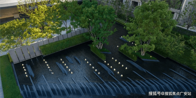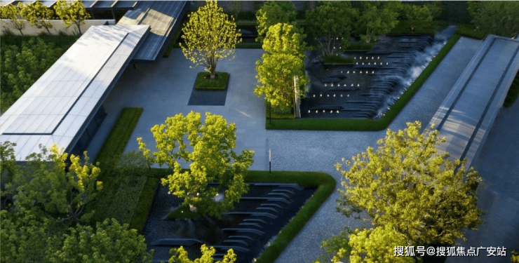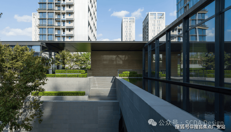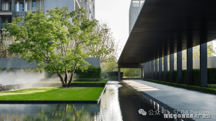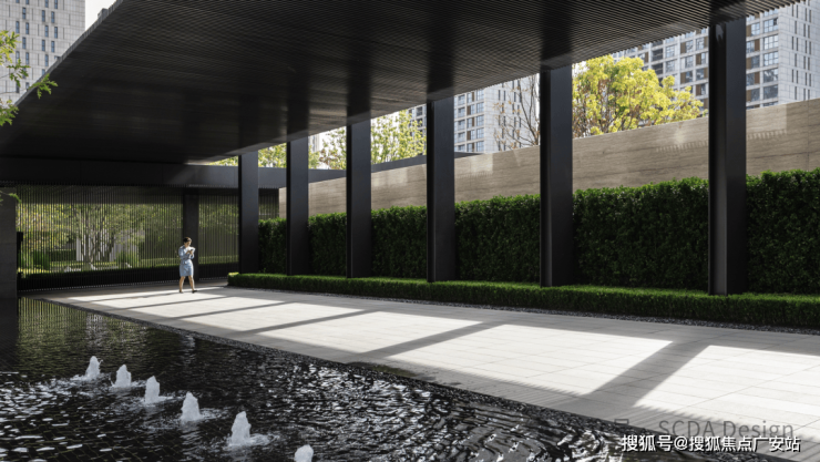 在公共空间设计方面,项目致力于创造一种平静而典雅的居住体验。从居住者的归家体验出发,设计了一个绿植和水景环绕的接待大堂前庭,通过景观走廊与会所前院连接,并通过阶梯引入下沉式庭院。这样的空间布局不仅触动人的感官,还通过丰富的绿植和水景交织,营造出一个层次分明、宁静雅致的环境。