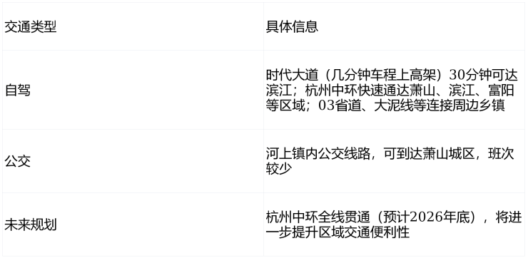 🏥医疗配套薄弱:河上镇仅有社区卫生服务中心,大型医院需前往萧山城区或滨江,约20-25公里