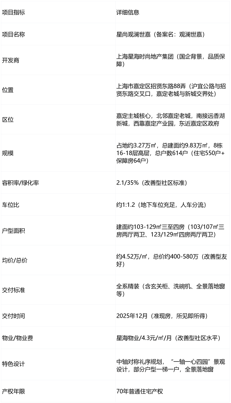星尚观澜世嘉是嘉定主城国企开发的准现房品质改善项目,兼顾老城成熟配套与新城发展潜力,适合追求国企品质、准现房安全、全家庭居住空间的改善型购房者,尤其适合在嘉定本地或虹桥枢纽附近工作的人群。