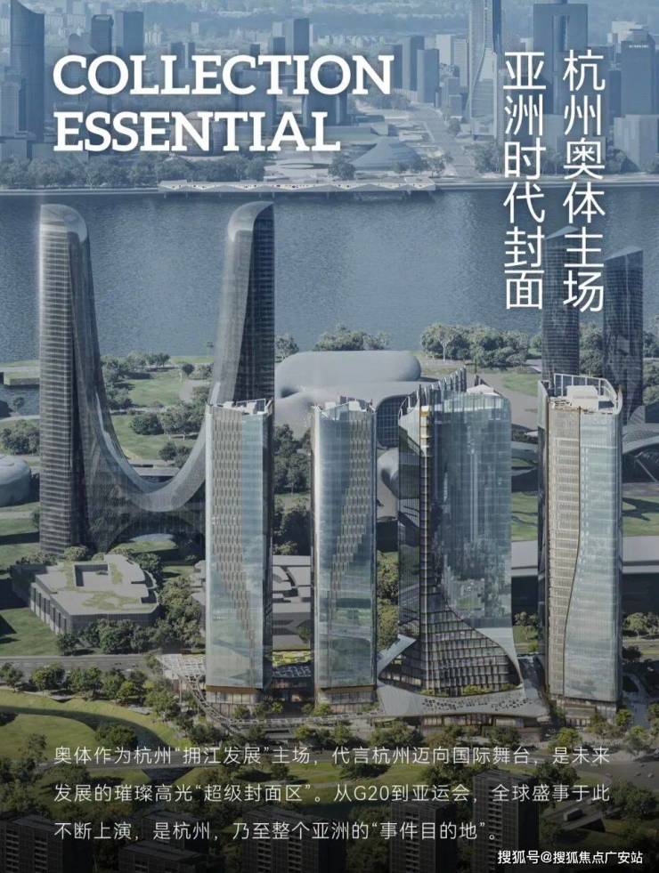 整个建筑群的布局沿着奔竞大道展开,由四栋塔楼和附属的酒店配套裙房共同组成。这个26万平方米的综合体项目,由七位行业大师联袂打造,其设计的核心理念是将国际化大师的智慧结晶、艺术性生活表达和杭州本土文化的融合,创新出一个独一无二的“城市会客厅”。