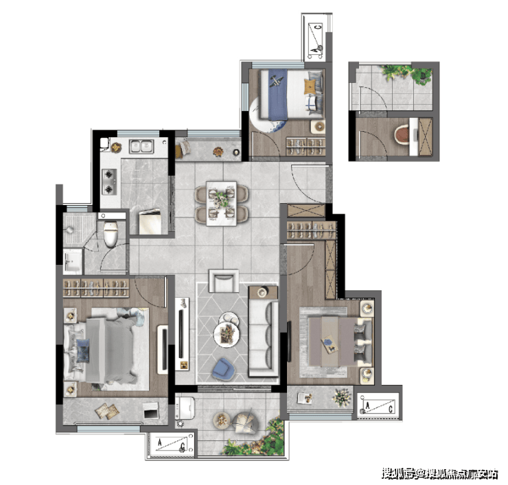 其次,该户型还做到了真正的动静分区。卧室的私密性完全不受公区影响,将舒适度与空间感拿捏得当。