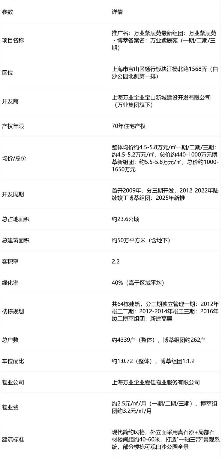 核心定位:万业集团打造的宝山杨行约50万方成熟大盘,白沙公园第一排生态住区,分三期开发(2009-2022年),涵盖高层、小高层、花园洋房,最新组团"博萃"主推约189-286㎡大平层,整体均价约4.5-5.8万元/㎡,总价约440-1650万元,适配刚需至终极改善全周期家庭