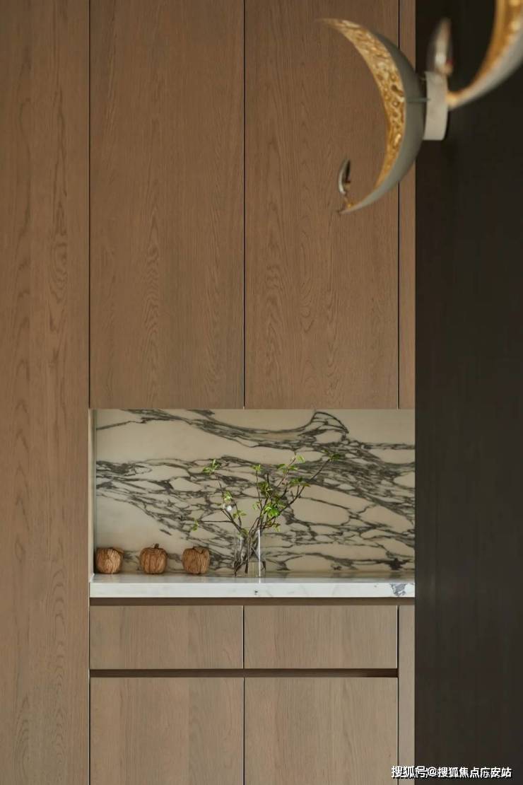 改变原结构无玄关的局面,塑造异形隔断,借由轻盈的悬浮造型与古木纹大理石台面形成对比,掀起第一轮视觉惊喜。渐变式格栅,造就出场域的音乐性,花艺与装饰画的意蕴高度契合,表述了居住者的生活态度和追求。
