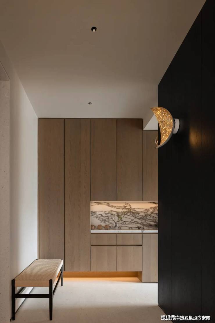 推开家门,一面深邃的黑木墙映入眼帘,如同一幅静谧的画布,仅以两盏独特的装饰灯点缀,仿佛预示归途的灯塔。