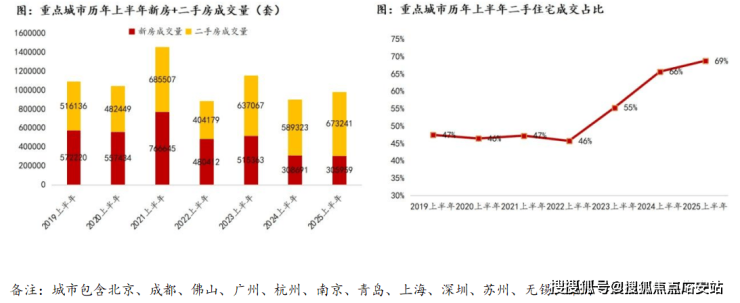 从市场占比方面看,自2023年上半年起,二手房成交比重逐步提升,2025年二手房成交占比进一步呈上升趋势。报告显示,上半年重点12城二手房成交比重占69%,较去年上半年上升3个百分点。