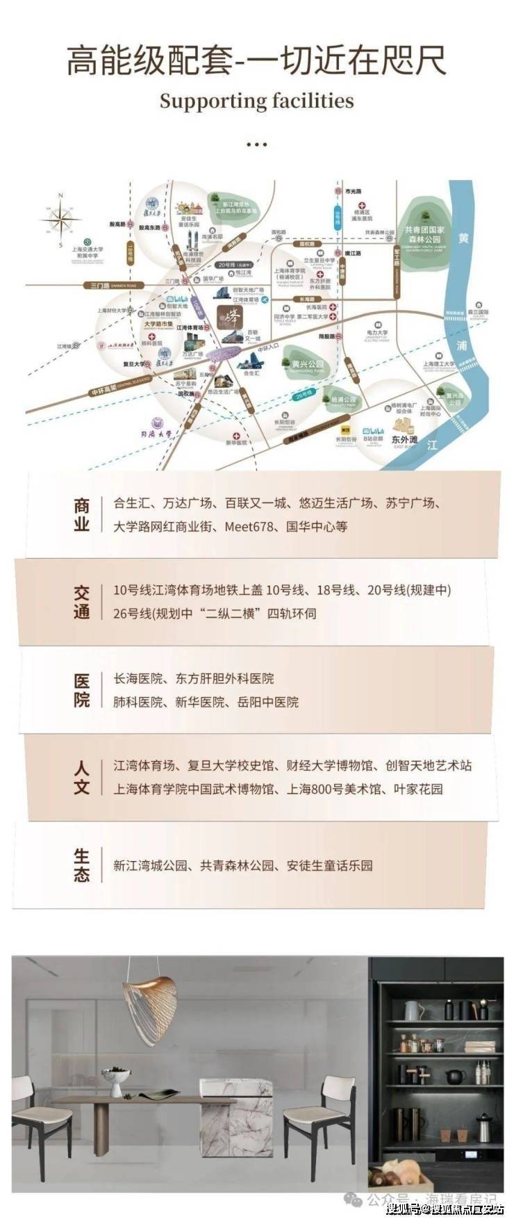 交通配套:地铁10号线江湾体育场站上盖,步行3分钟可达,规划中的18、20、26号线距离项目200米内;自驾可通过中环路、翔殷路隧道、淞沪路高架,30分钟可达浦东机场。