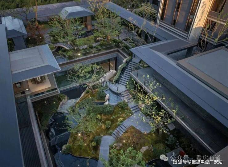 近460㎡的下沉式庭院,精选太行山金景石堆叠成小山丘,溪水,并移栽岭南珍贵的古桩铁冬青和中华原生乌桕树,寓意“聚财守业”!
