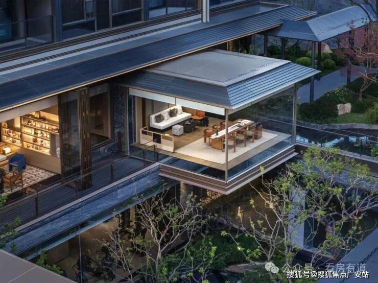 其中最令我惊喜的是这个占据社区最佳观景位的"悬亭茶室"。这是一个悬浮式的空间,一方面可俯瞰整个下沉庭院,景色绝美;另一方面,与亲朋好友在此品名洽谈聚会时,颇有“高山流水觅知音”的东方意境。