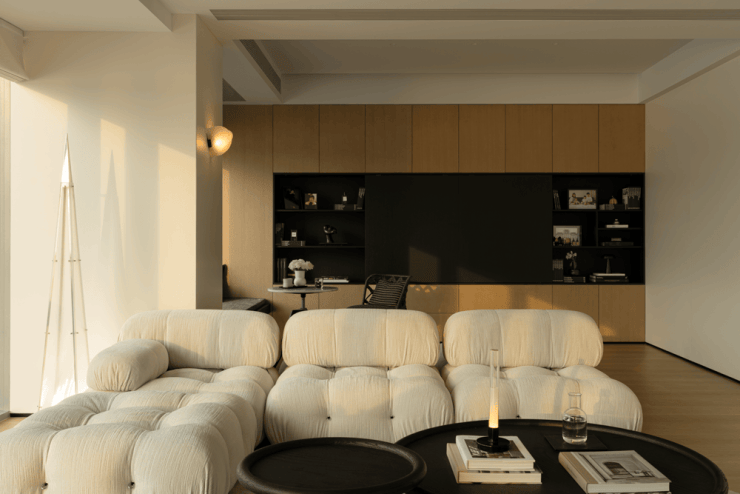 全开放式设计,岛形沙发打破边界,让交流随光影自由发生。午后的光线从侧面洒落,家具被赋予立体的光影层次。