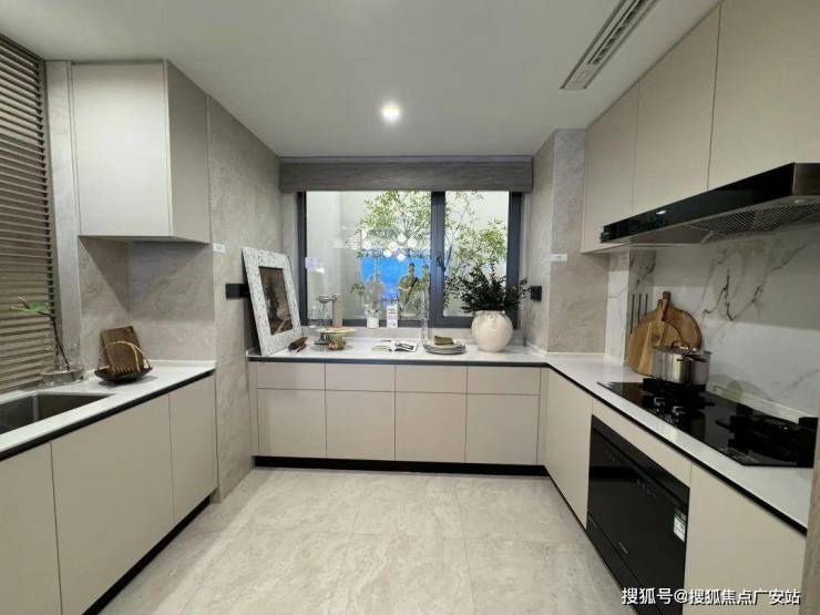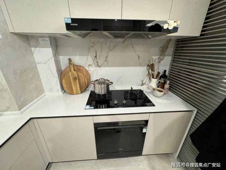 厨房顶部是线性凉霸,比较美观,弗兰卡水槽、西门子油烟机和燃气灶、方太洗碗机。灶台背后也是一大块卡拉卡金奢板,颜值高也便于打理。