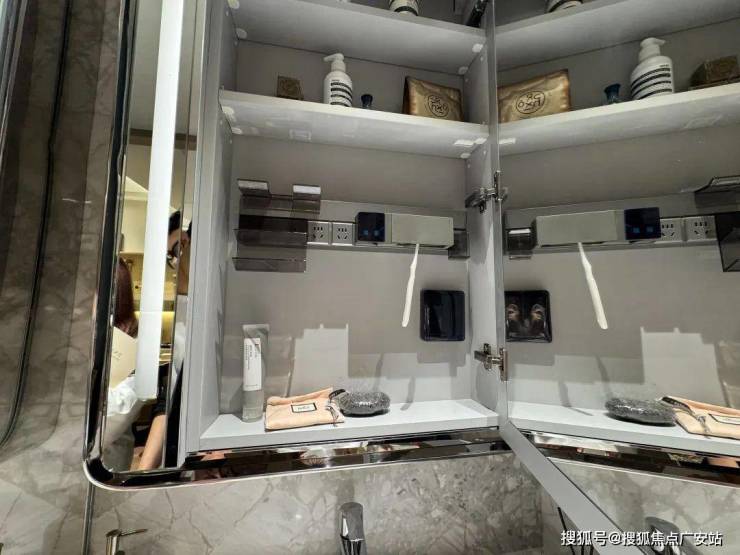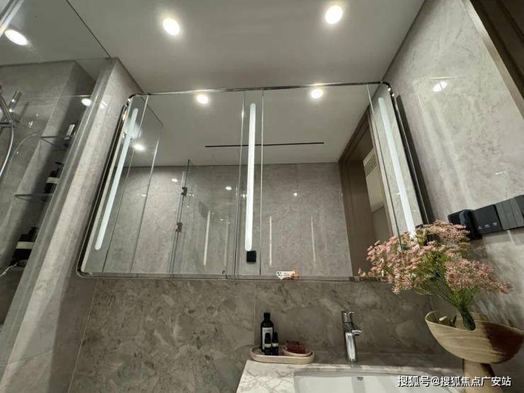 卫生间镜柜有个小小的亮点就是采用了镀铬镜柜边框,主卧镜柜有美妆冰箱,柜体也是通长的,收纳比较足。