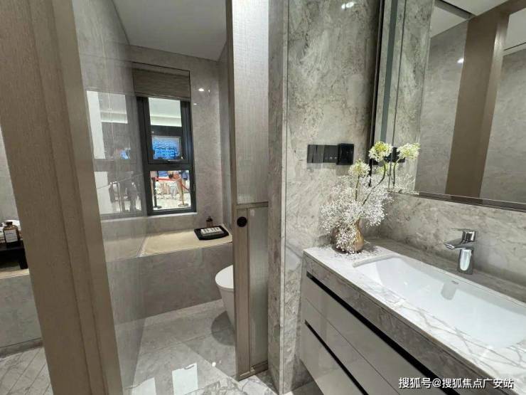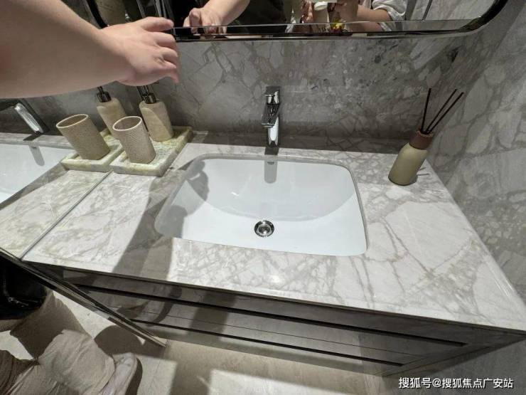和华润宝山项目不太一样的是,时代之城也有很多采用奢石奢玉的地方,不过花纹不会有太浓烈的海派风格。玄关柜背板用的是白雪公主奢玉,大理石台面、高仪台盆+龙头,还帮你们做好了挡水沿。