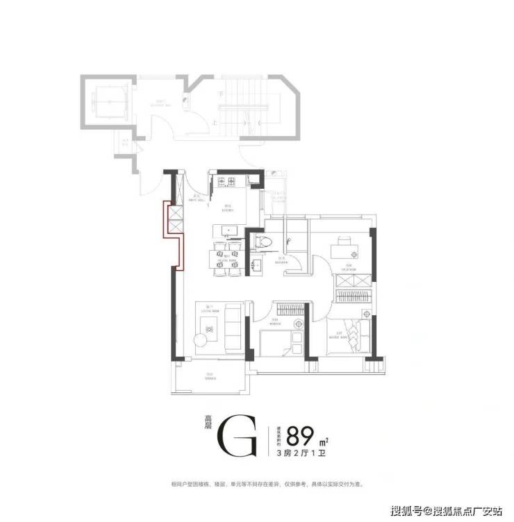 再来看下89㎡户型,3房2厅1卫,大体布局和装标与109㎡比较类似,区别在于这个小户型有S墙,卫生间做到了真正的“三分离”!