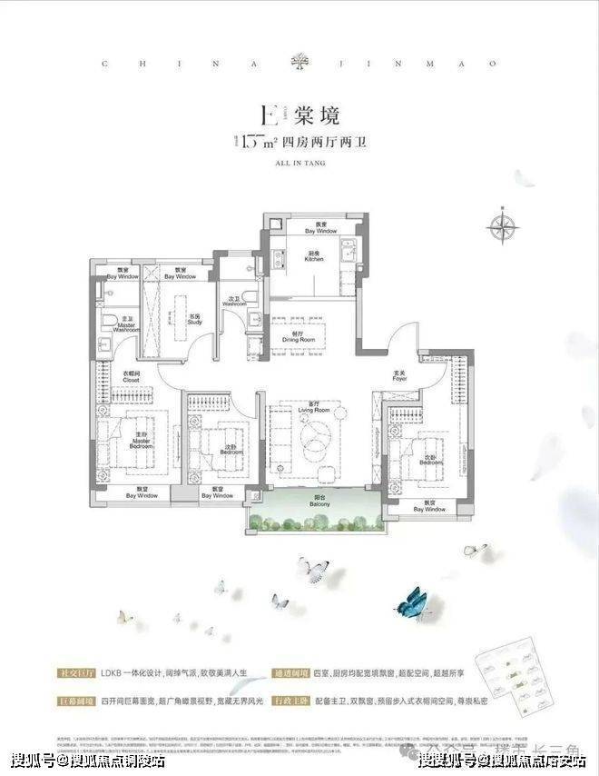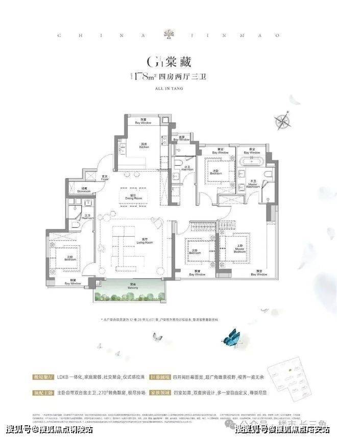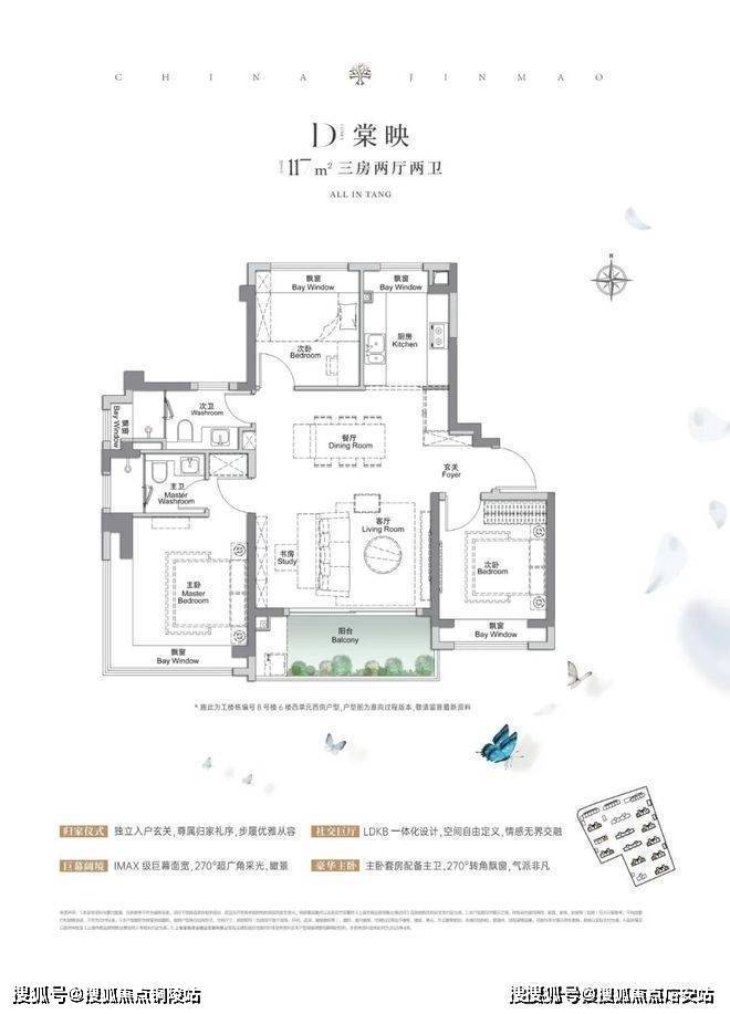 建面约117㎡3房2厅2卫,做到了3+1开间朝南5个飘窗+主卧套房设计+270°转角飘窗,所有的尺度都有进一步提升。