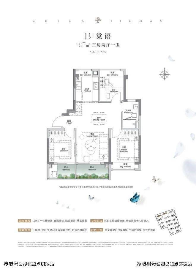 建面约97㎡3房2厅1卫,户型三开间朝南、再加上“3个飘窗+双面阳台系统”,不管是采光、视野、通风、私密性,还是实用性都十分出色。
