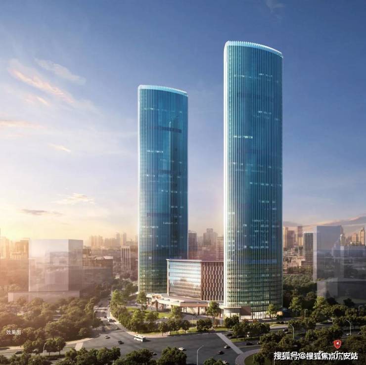 基本参数:项目由 250 米双塔地标(T1 写字楼、T2 行政公寓)+12 层裙楼兰博基尼酒店组成,总建筑面积约 30 万㎡,容积率 2.5,绿化率高达 83%。