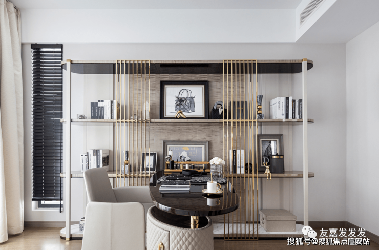 书房中的书桌设计,以柔美的曲线为主调,这种设计不仅符合人体工程学原理,减少了长时间使用电脑或书写时的疲劳感,同时也彰显了设计师对于细节的关注与追求.高品质的桌面材质与细腻的纹理处理,进一步提升了整个区域的质感与档次.