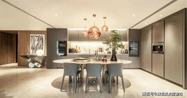 厨房,作为家庭生活中的重要场所,不仅是烹饪美食的舞台,更是家庭温馨与亲情的交汇点.在这套豪宅的设计中,厨房同样被赋予了独特的魅力和情感价值.为了避免厨房设计显得过于平庸,设计师还巧妙地加入了艺术元素.这些艺术元素与厨房的实用功能相结合,既提升了整体空间的美感,又让居住者在烹饪过程中能够享受到一种艺术与生活的交融.