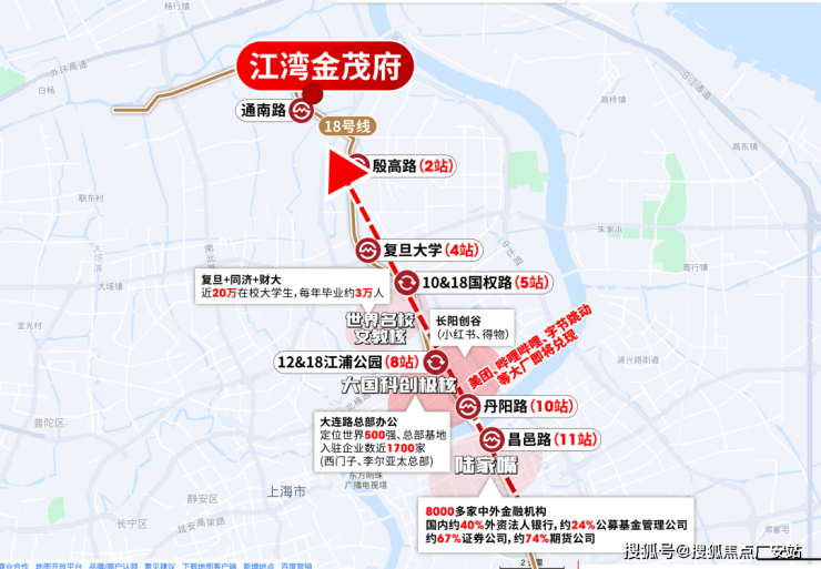 另一方面18号线更串联起“世界文教核-大国科创极核-全球金融极核”,复旦、财大、同济,大连路总部集群、杨浦滨江大厂、陆家嘴金融圈均分布在这条线路上。