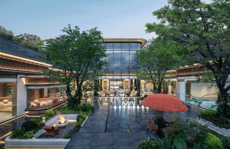 项目跳出简单的绿化堆砌,打造罕见“云台叠境”立体园林,三重台地搭配跌水、观景平台、下沉卡座与花厅,一步一景。将酒店式的仪式感与隐秘感实景落地,让效果图里的诗意,变成日常风景。
