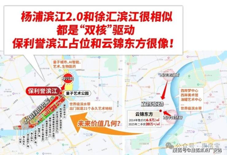 值得一提,保利誉滨江在杨浦滨江2.0的位置,与云锦东方如出一辙——二者均处于“双核辐射的中心点”。你要知道云锦东方2014年售价约6.5万/㎡,如今已突破20万+/㎡。