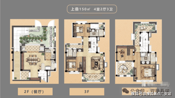 上叠户型是建筑面积150平米的三层,4房2厅中西双厨的全套房设计,特设独立花园入户通道,保障业主私密性。