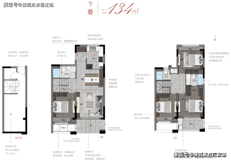 ▲建面约134㎡下叠户型地下室和一层示意图