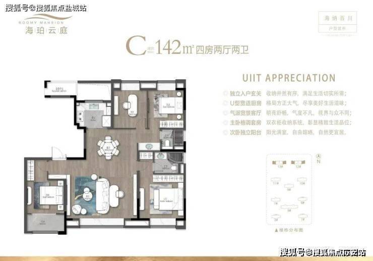 主力户型:142㎡、166㎡、188㎡四居室,设计采用四开间朝南、南北双阳台布局,部分户型配置横厅及三卫设计,精装交付