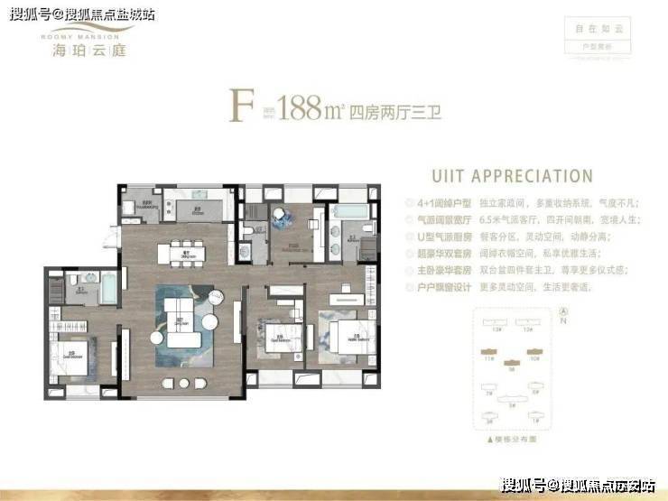 昆山海珀云庭售楼处电话☎:400-8878-824(售楼处预约看房热线)作为项目最大户型,建面约188㎡户型空间尺寸最阔绰,同样是四开间朝南+户户飘窗设计,南向6.5m宽厅连通交互式餐厨空间,空间更加宽敞明亮;主卧套房设计,宽敞的步入式衣帽间直击女主人的内心,同步设有双人台盆,私密性更强。